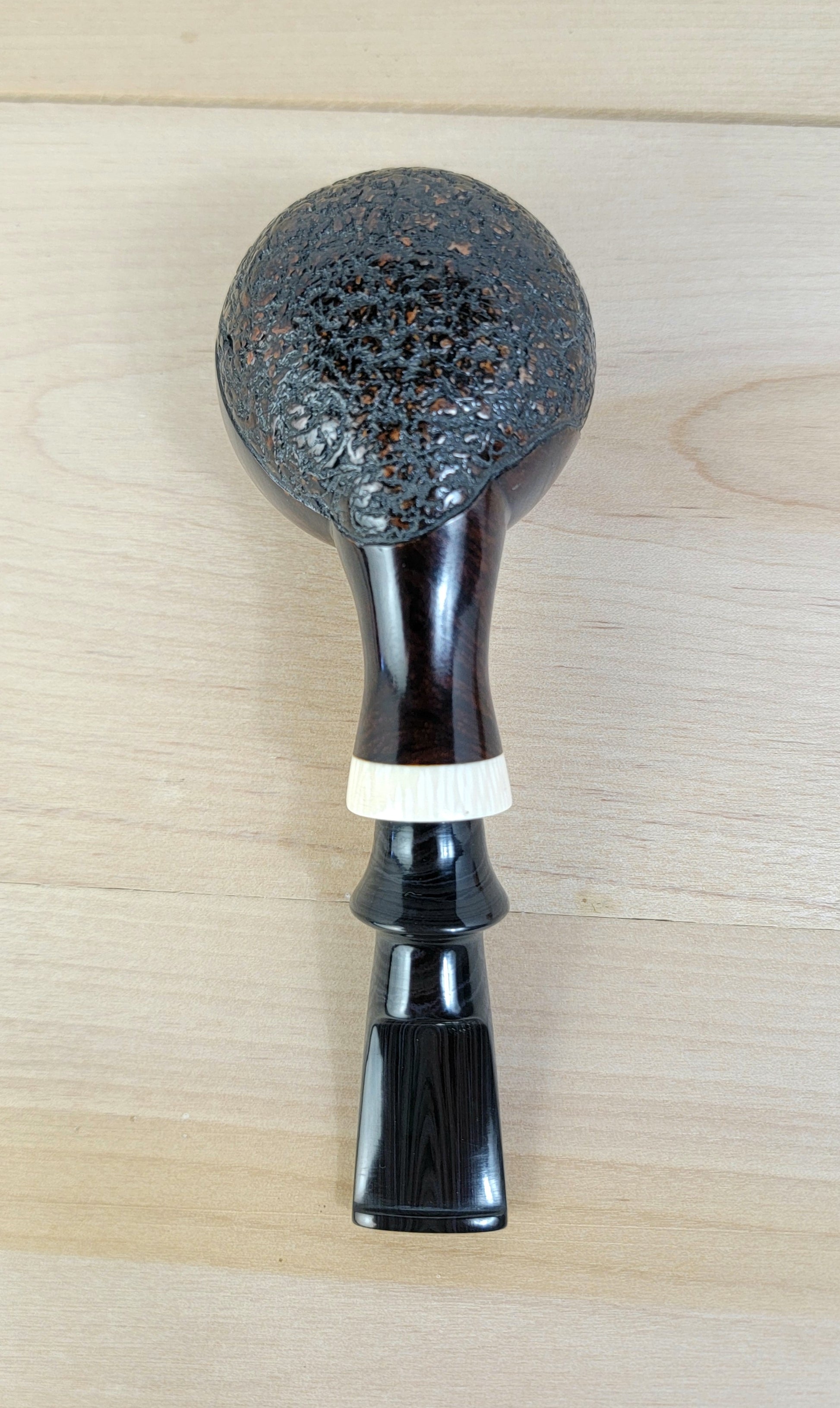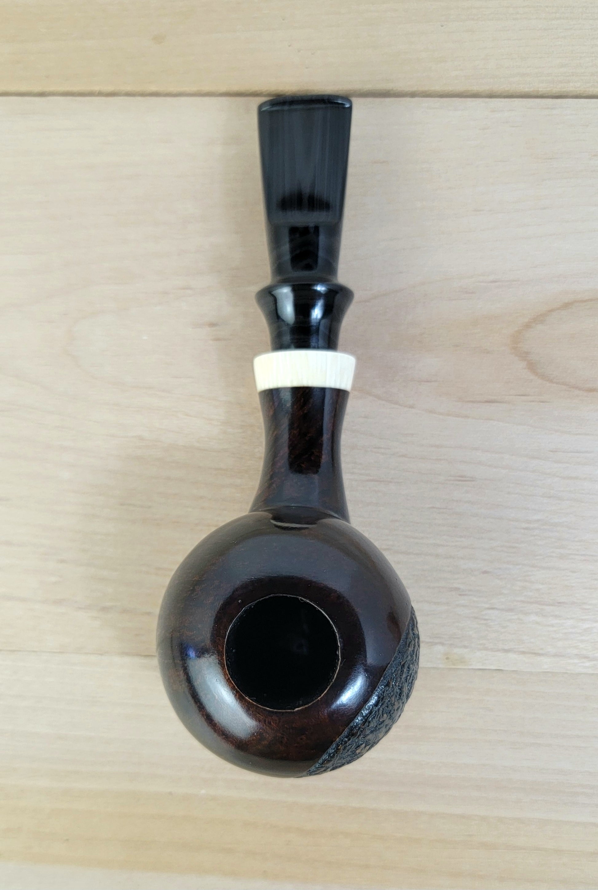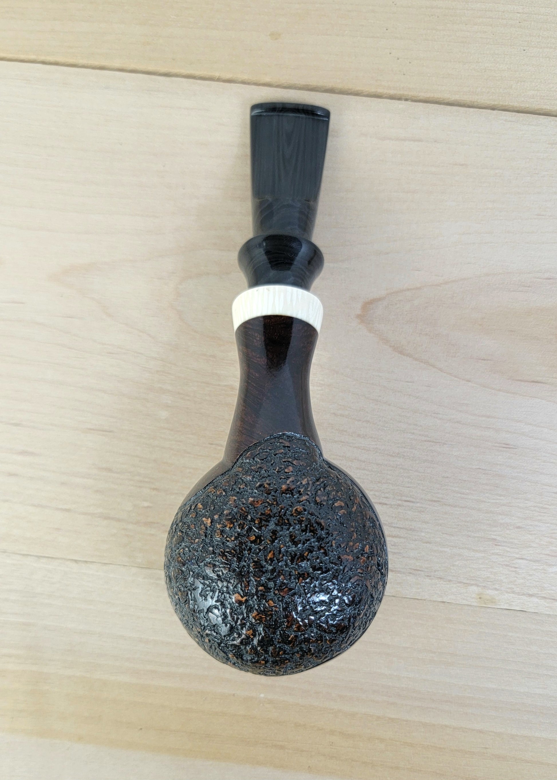 A handmade, one of a kind pipe. crafted from briar, faux ivory, and an aubergine swirl ebonite stem. This pipe is a nice handful, weighty and balanced. The partial rustication adds unique character and the ivory really pops against the dark of the briar and ebonite.