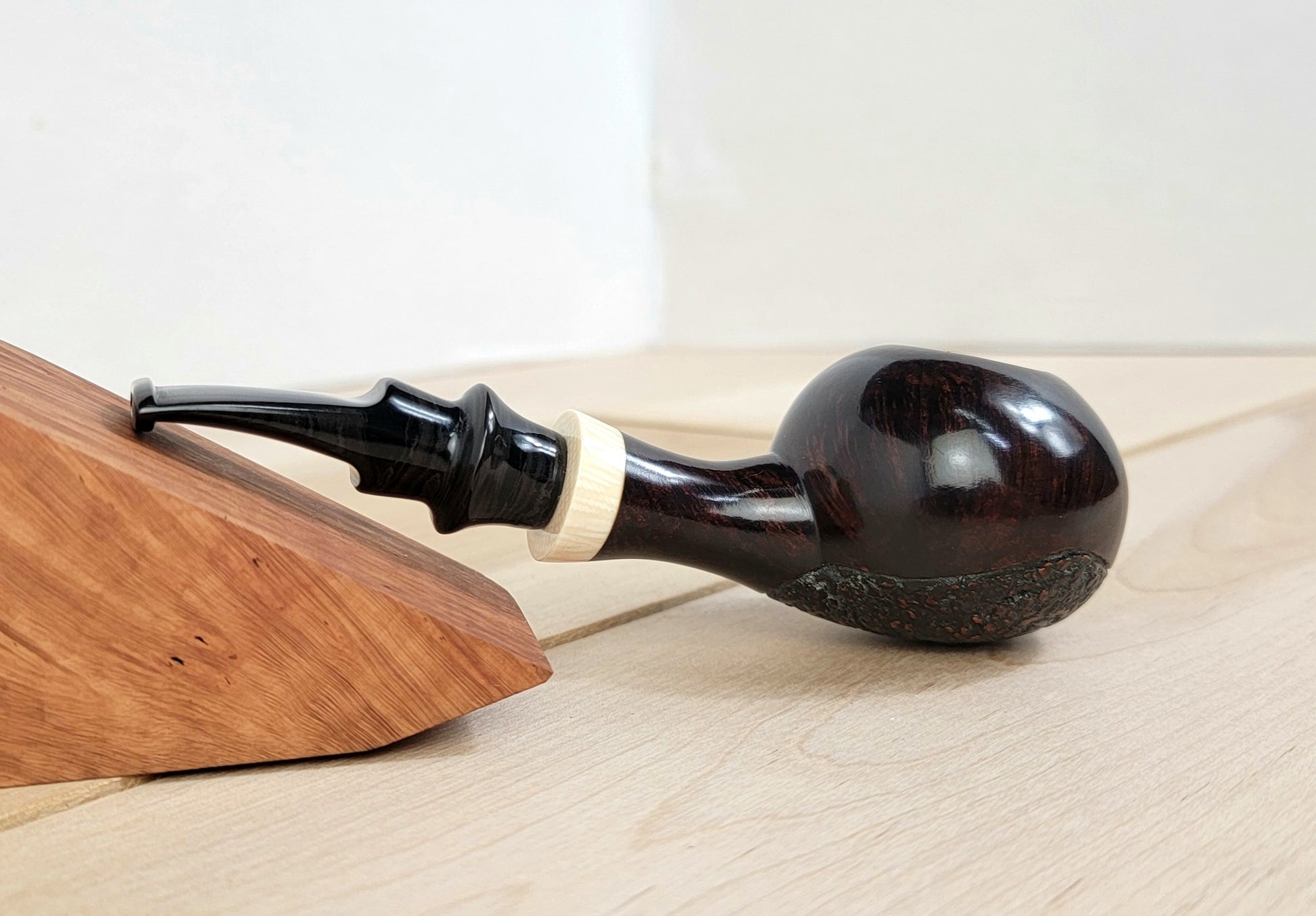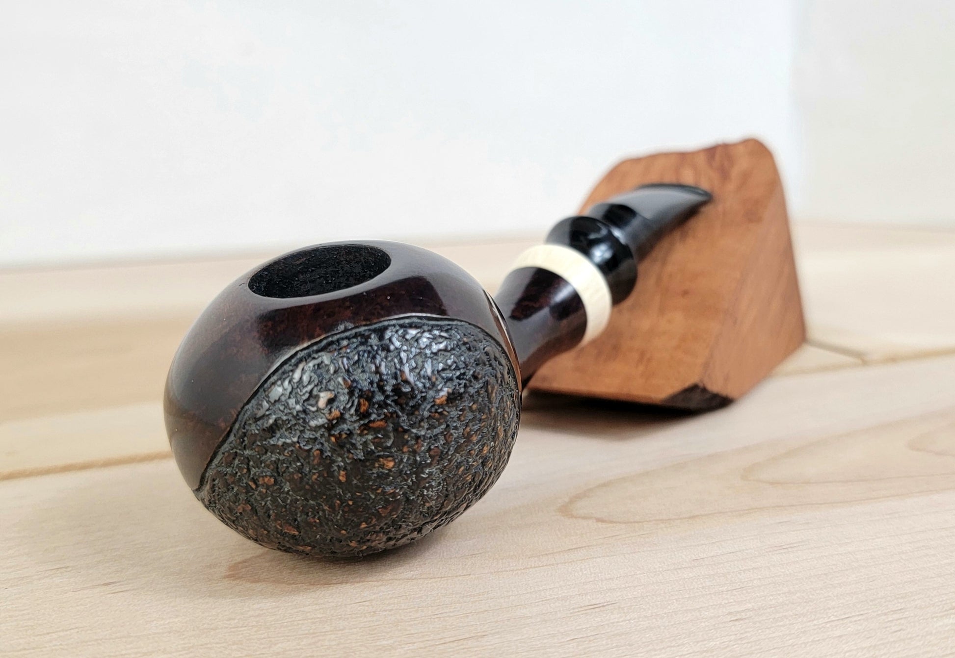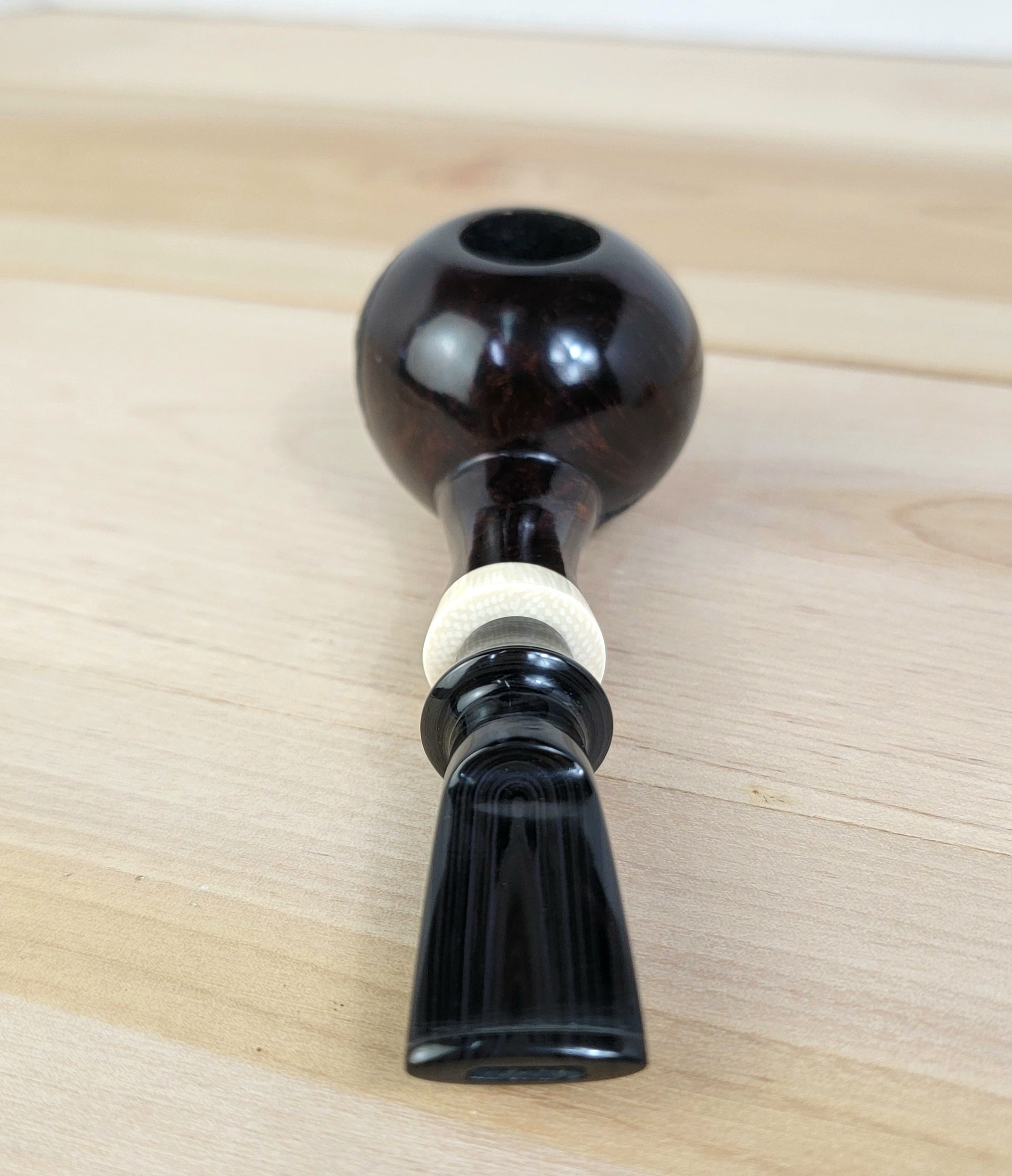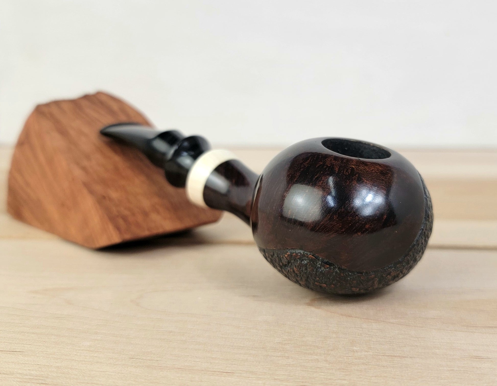 A handmade, one of a kind pipe. crafted from briar, faux ivory, and an aubergine swirl ebonite stem. This pipe is a nice handful, weighty and balanced. The partial rustication adds unique character and the ivory really pops against the dark of the briar and ebonite.