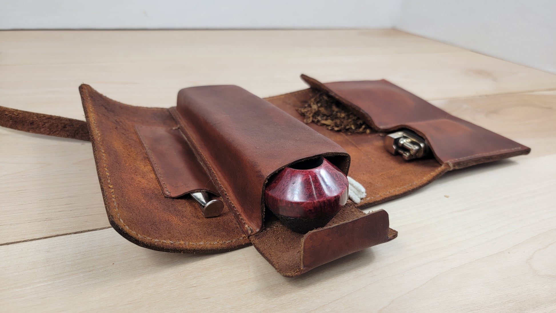 Looking for a convenient way to safely bring everything you need for a fantastic smoke anywhere? This durable veg-tan leather pipe roll will fit the bill with storage for your tobacco, pipe tool, cleaners, lighter and pipe! The molded pipe storage adds extra protection for your pipe. Simple, durable and ready for years of service! These are made to order in a variety of colors, so allow 2 weeks for this to be made and shipped.
